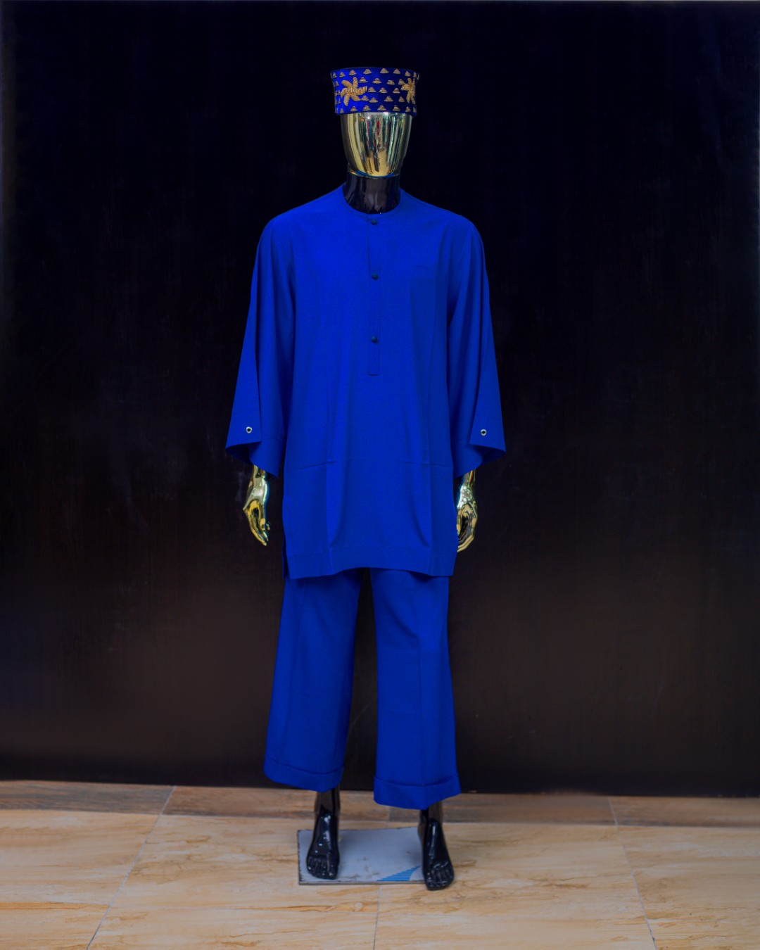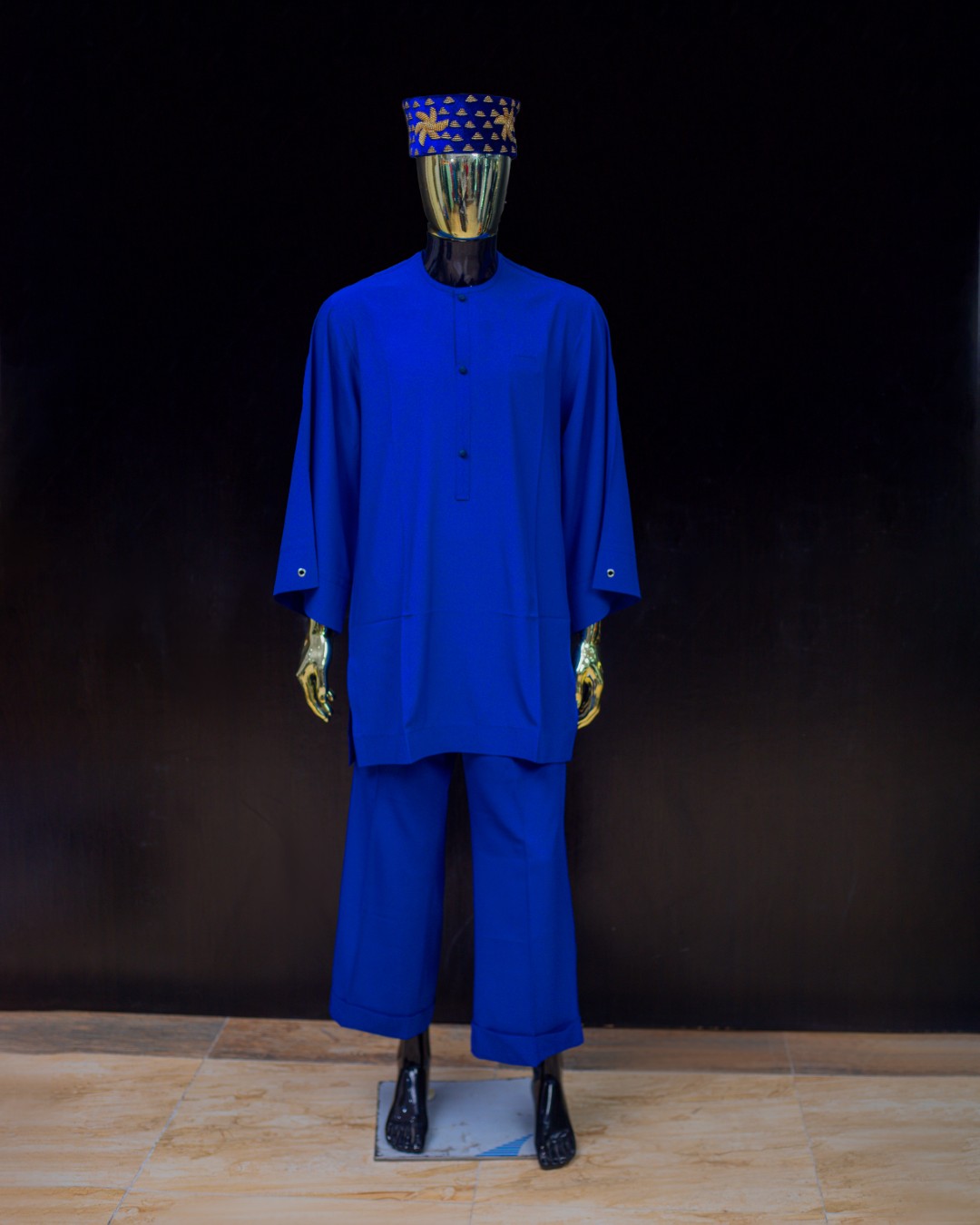 Royal Blue Men's Kaftan Set with Embellished Cap
